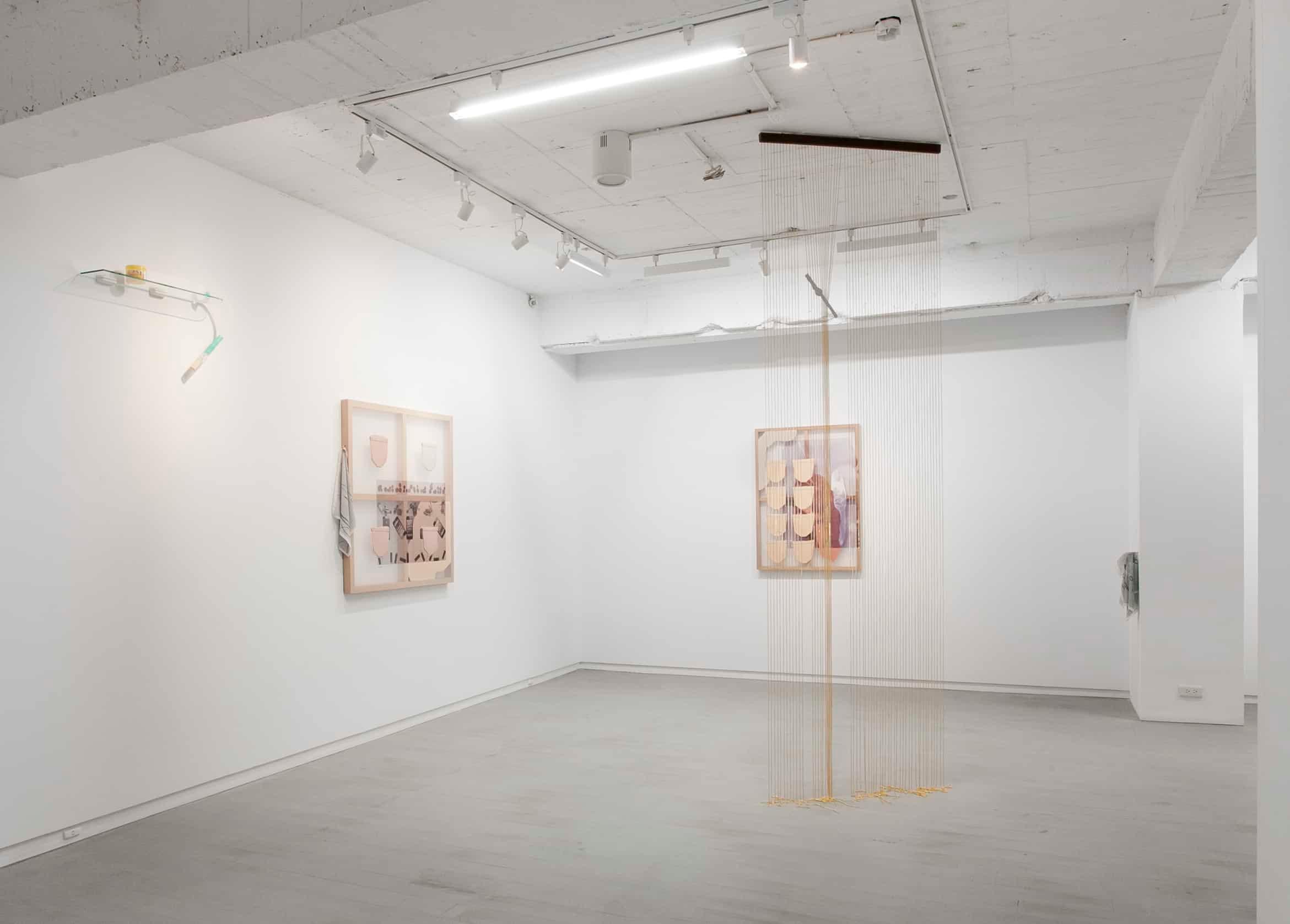 除了視覺語彙之外,嗅覺更是展覽中一個不顯眼卻重要的元素。藝術家選取了常見的固體芳香劑作為一個暗喻的對象,其廉價的形象與氣味卻也精準標誌了某些共同經驗,其座標可能位於旅途中不得不的暫停,或是公共空間中赤裸的私密片刻。而味覺這看不見的存在,也同時回應至標題,以氣味填滿與探索空間的形狀。